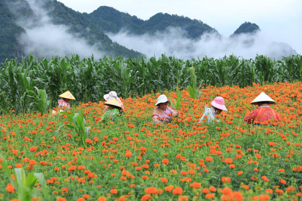 7月21日,云南腾冲市固东镇农民在凤凰山采收万寿菊。新华社发(龚祖金摄)
