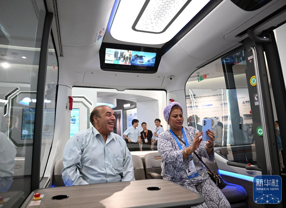 ↑ 7月24日,上海合作组织媒体智库峰会与会代表在郑州市宇通品牌体验中心体验无人驾驶巴士。新华社记者 李嘉南 摄