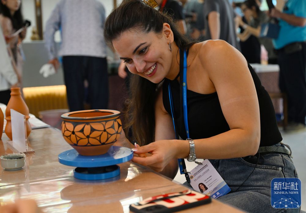 ↑ 7月23日,上海合作组织媒体智库峰会与会代表在河南仰韶酒业有限公司体验彩陶绘制。新华社记者 郝源 摄