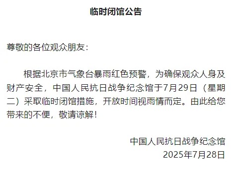 7月28日,中国人民抗日战争纪念馆发布临时闭馆公告,根据北京市气象台暴雨红色预警,为确保观众人身及财产安全,中国人民抗日战争纪念馆于7月29日(星期二)采取临时闭馆措施,开放时间视雨情而定。由此给您带来的不便,敬请谅解!