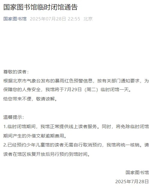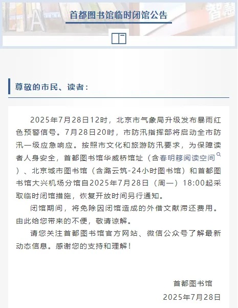 7月28日,首都图书馆发布临时闭馆公告,按照市文化和旅游防汛要求,为保障读者人身安全,首都图书馆华威桥馆址(含春明簃阅读空间)、北京城市图书馆(含潞云筑-24小时图书馆)和首都图书馆大兴机场分馆自2025年7月28日(周一)18:00起采取临时闭馆措施,恢复开放时间另行通知。闭馆期间,将免除因闭馆造成的外借文献滞还费用。由此给您带来的不便,敬请谅解。