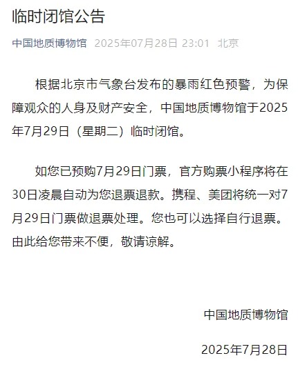 7月28日,中国地质博物馆发布临时闭馆公告,根据北京市气象台发布的暴雨红色预警,为保障观众的人身及财产安全,中国地质博物馆于2025年7月29日(星期二)临时闭馆。