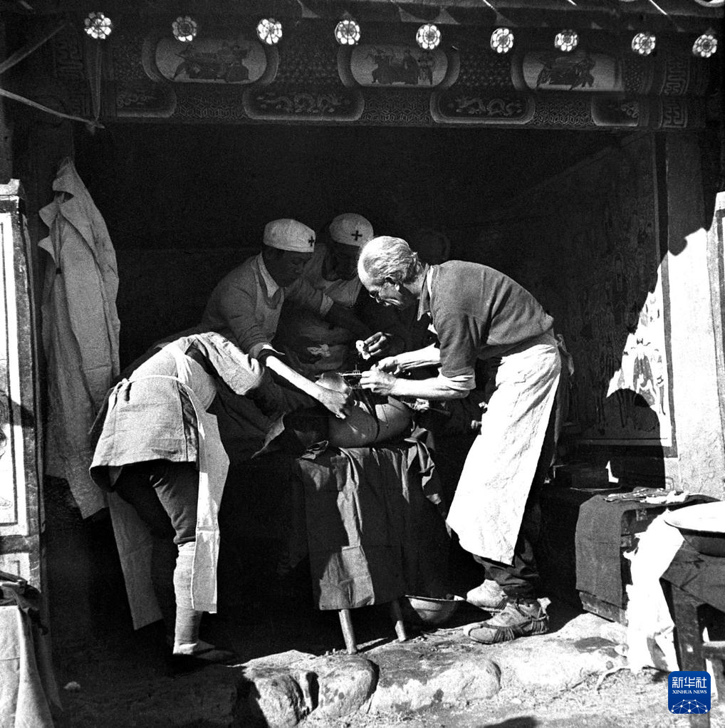 白求恩在晋察冀边区涞源县临时手术室里为伤员做手术(资料照片)。新华社发