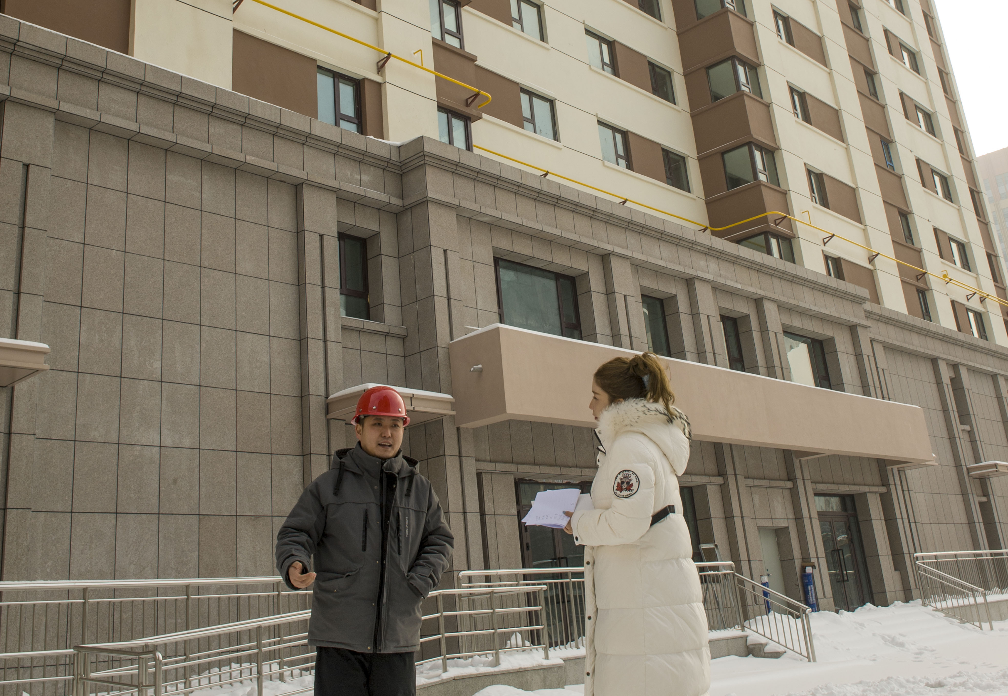 2024年11月26日,当代兵团杂志社记者斯穆芭提·萨提别克在十一师建工集团东庭·风韵项目部采访总工程师。
