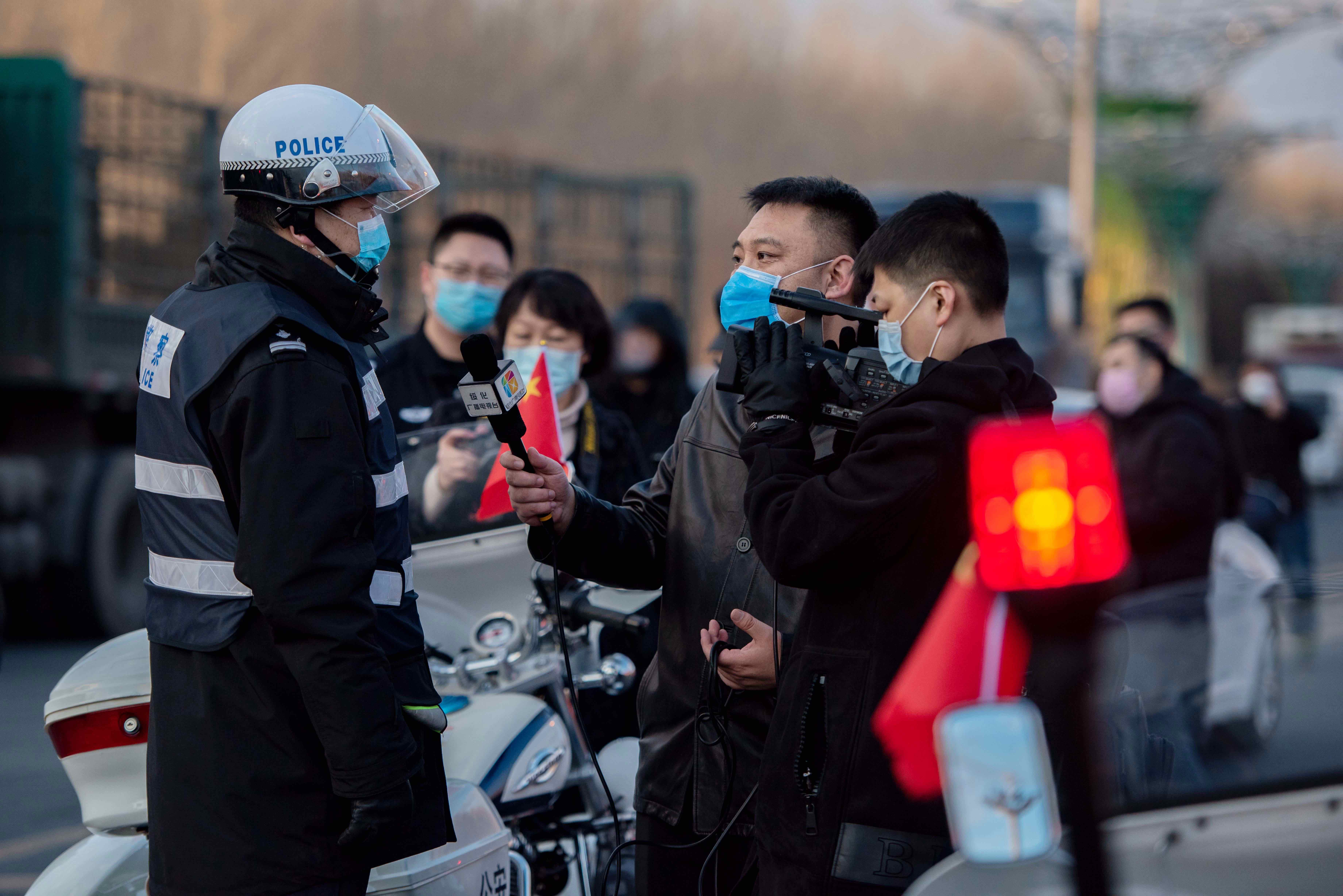 2020年闫振刚在绥化市绥南高速路口采访护送援鄂医疗队回家的铁骑护卫队