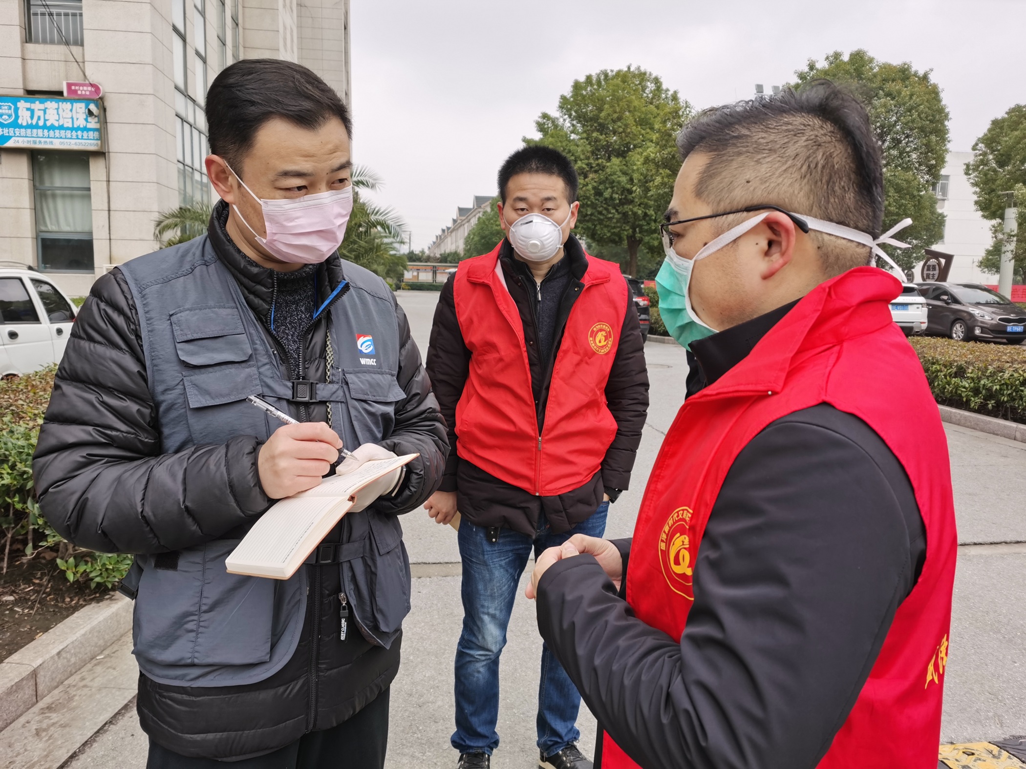 2020年疫情期间,张兰飞在采访吴江区盛泽镇人福村工作人员疫情防控情况