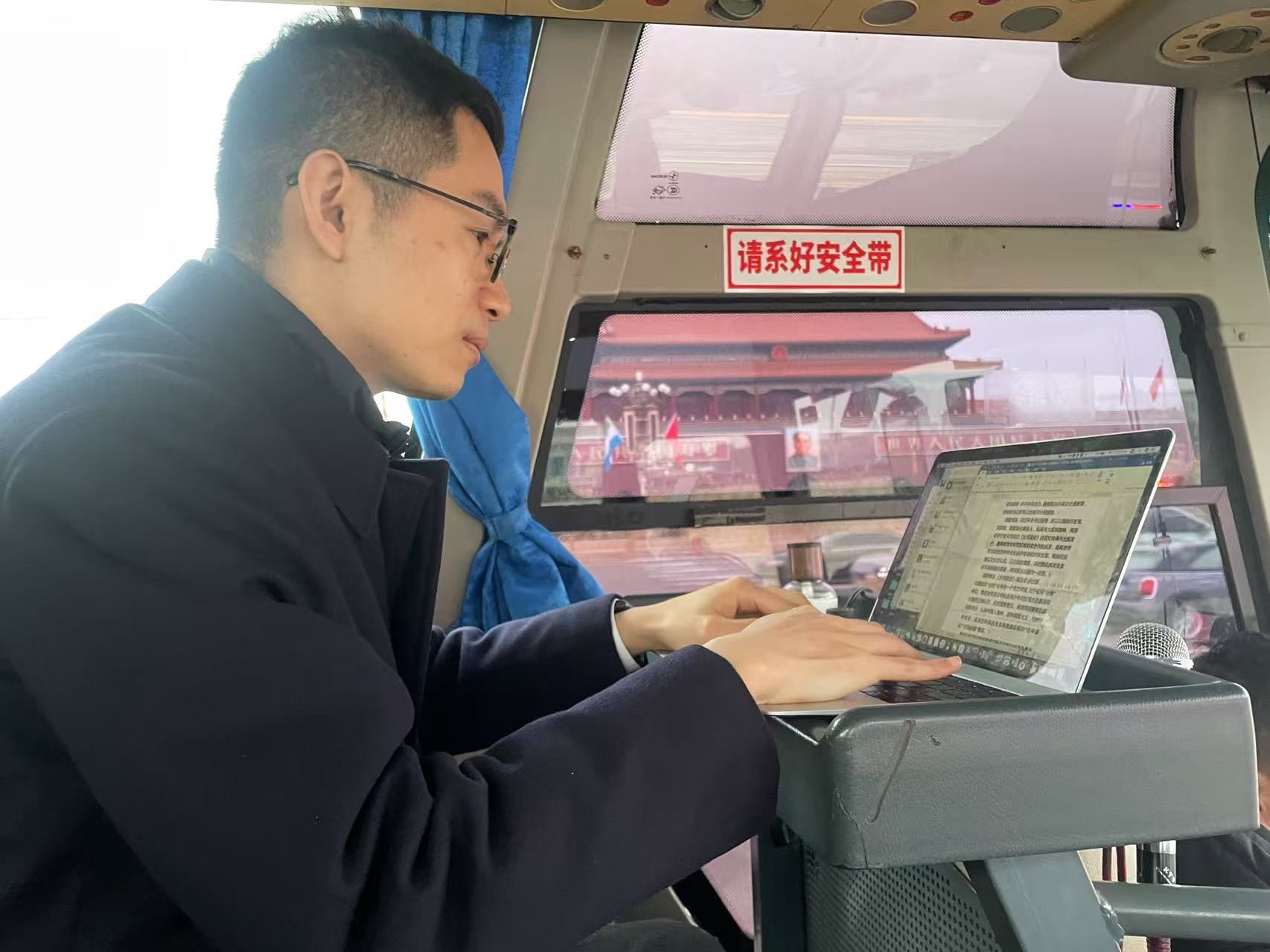 全国两会期间在中巴上撰写新闻稿件
