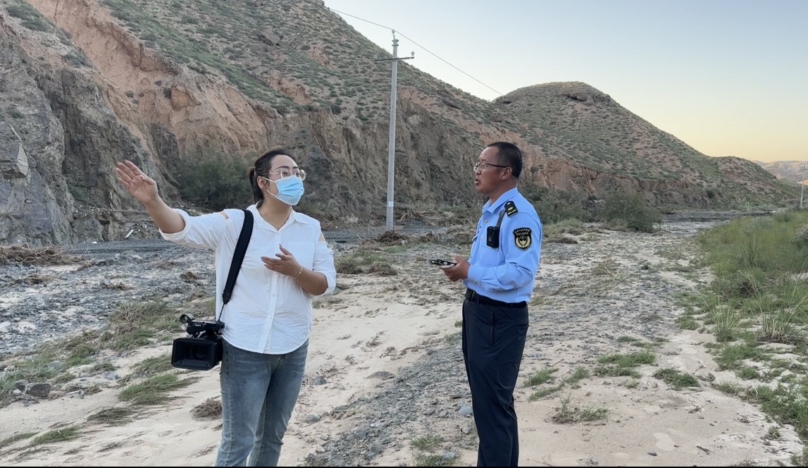 中卫市新闻传媒中心杨珮珮在采访民生新闻报道时向职能部门工作人员反映某大型养殖场非法排污情况。