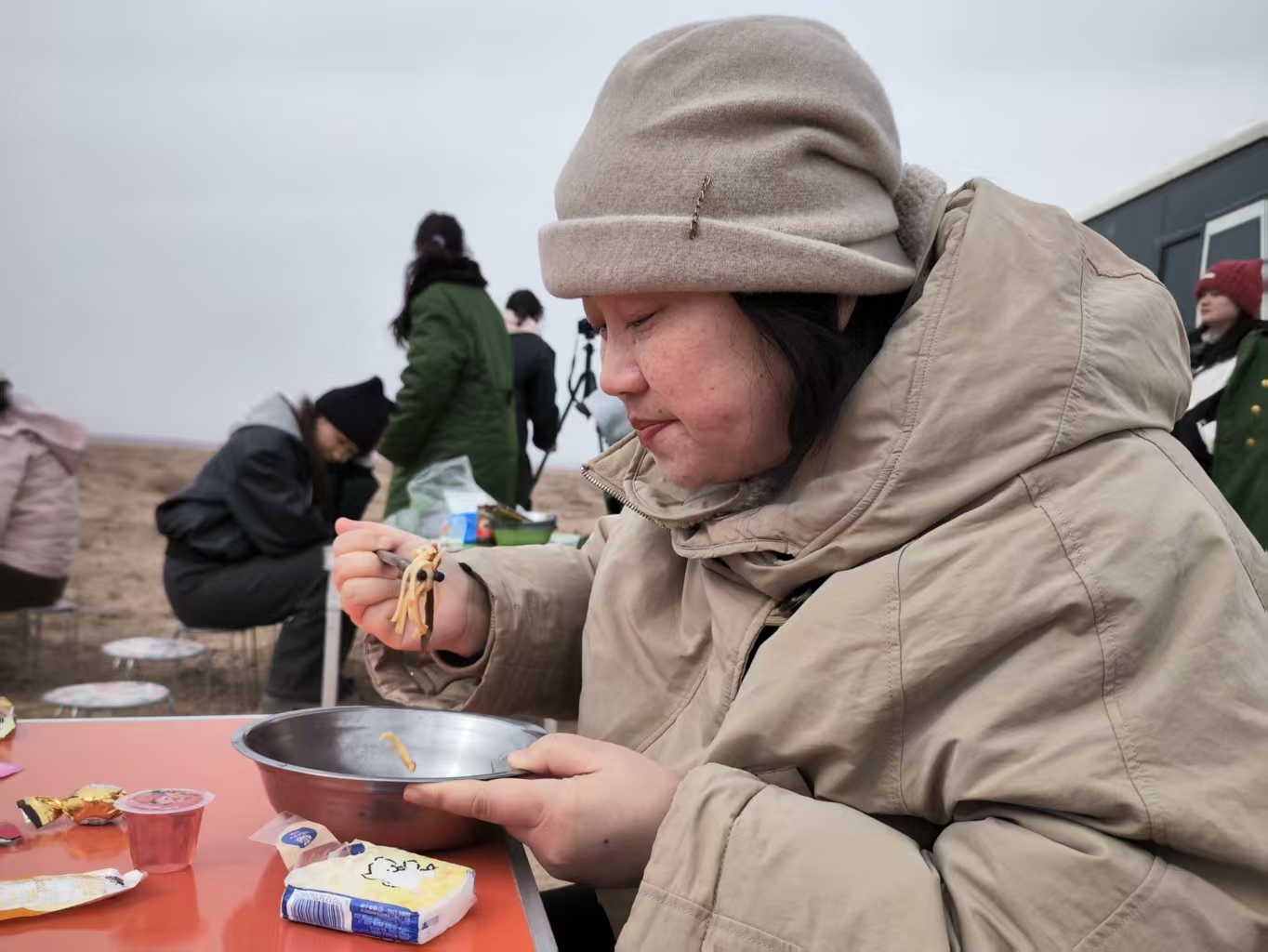 2025年3月,戴维在甘肃民勤采访种梭梭的青年志愿者,和他们一起在荒原上午餐