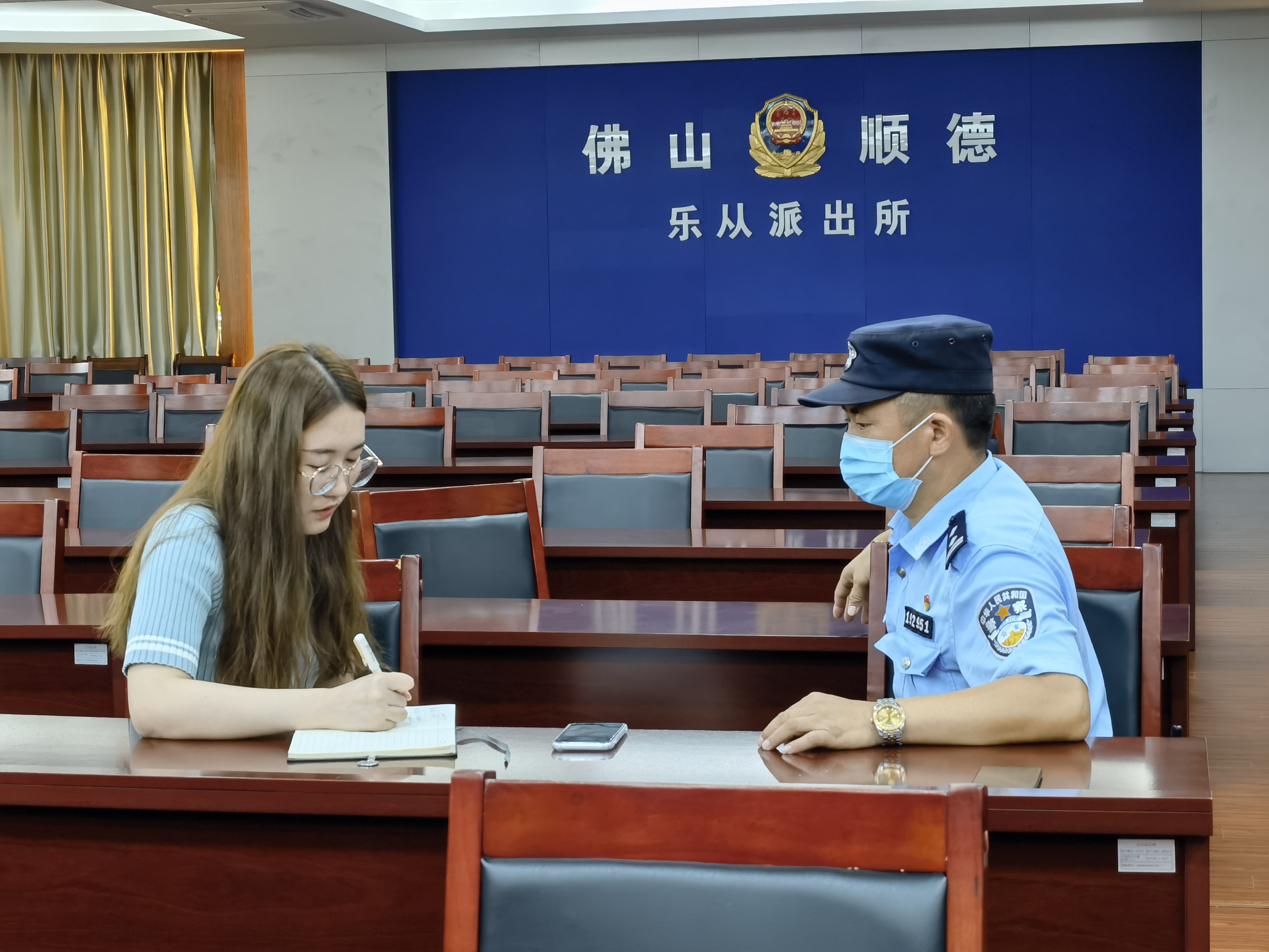 南方都市报记者韦娟明正在采访佛山民警。