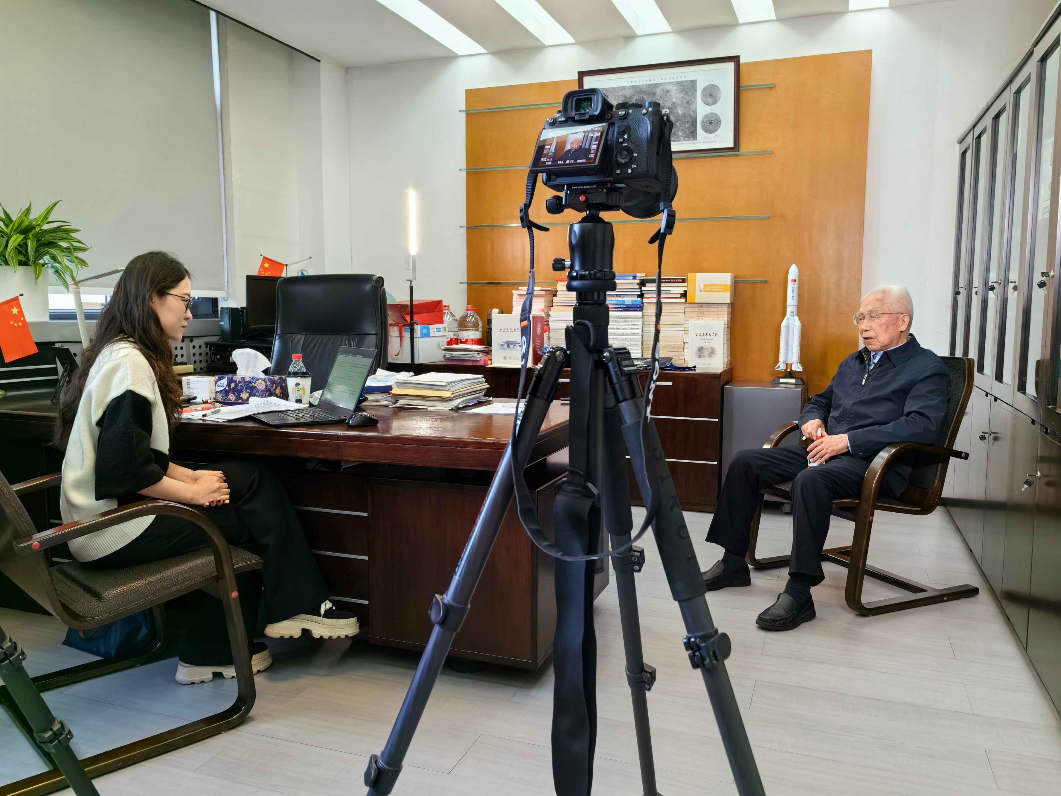 现场采访中国工程院院士、我国著名火箭总体技术专家龙乐豪.