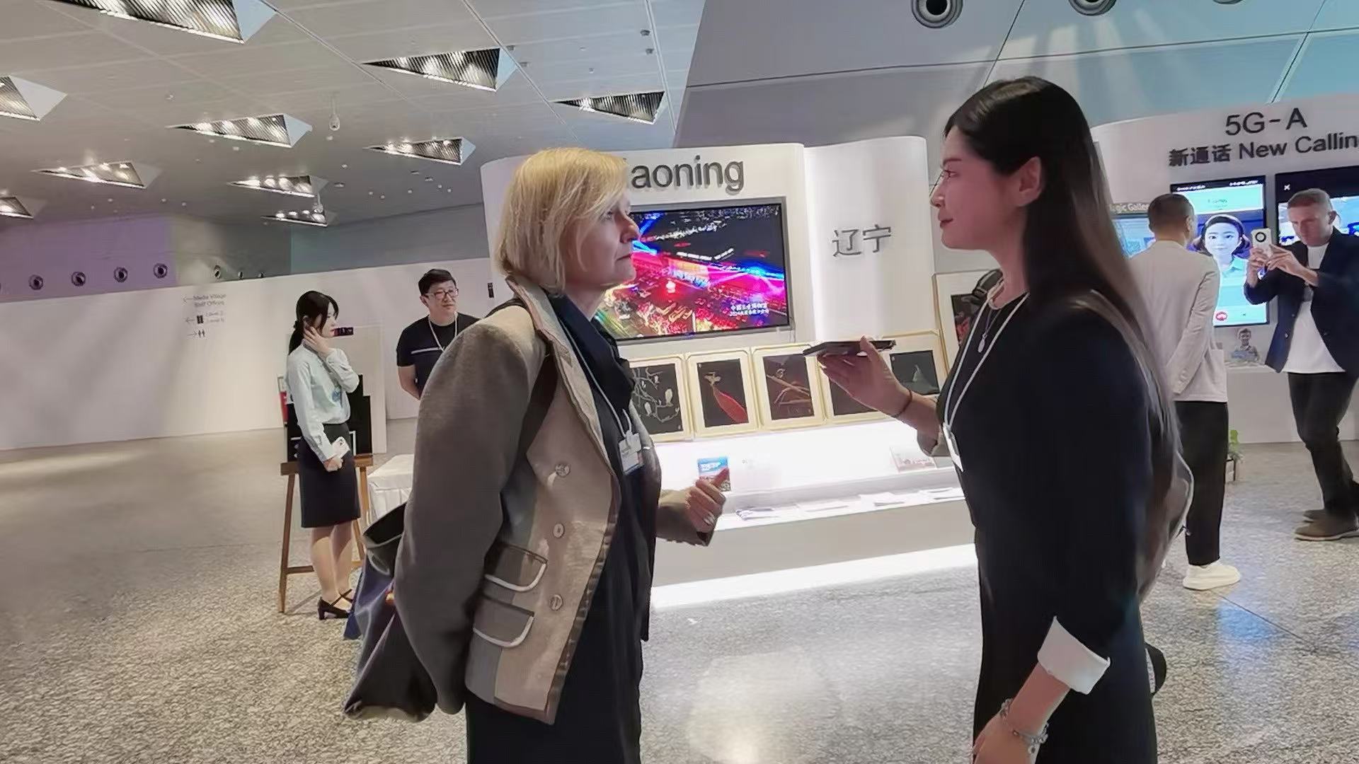 葛鑫在2024大连夏季达沃斯世界经济论坛的文化展区,采访英国《自然》杂志总编辑玛格达莱娜·斯基珀博士,她谈到对中国文化发展的见解。