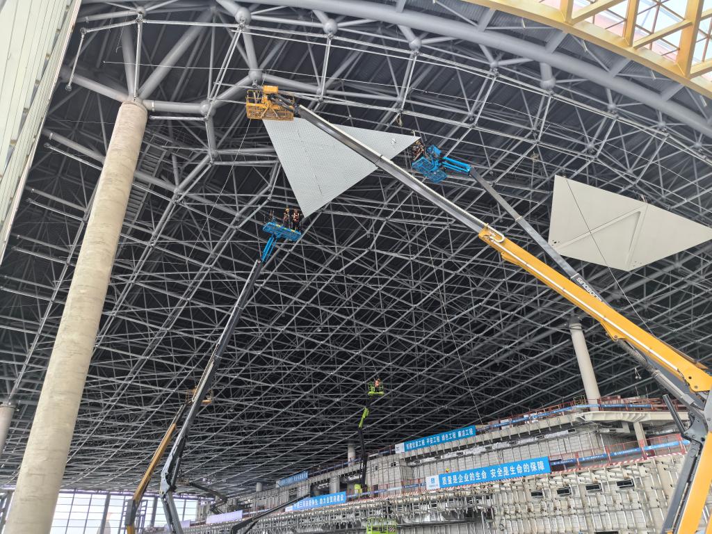 工人正在对T3航站楼进行室内装饰装修。(中建三局供图)