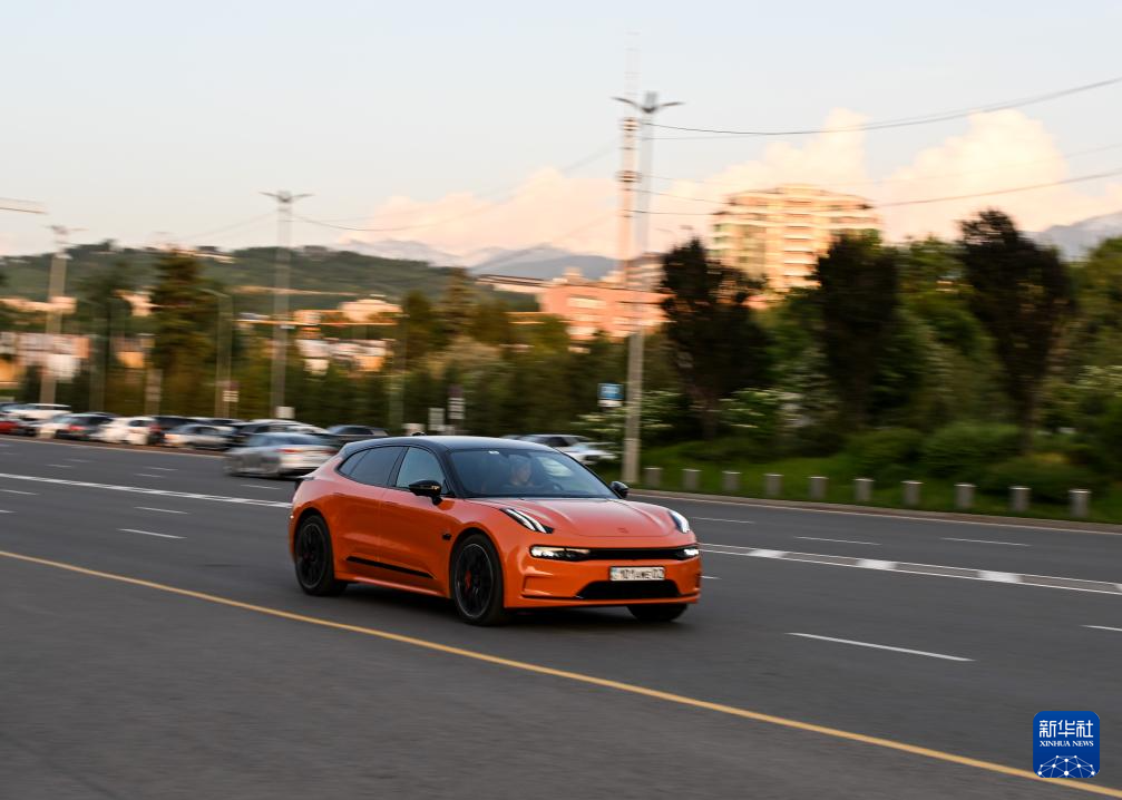 5月15日,一辆中国品牌新能源汽车行驶在哈萨克斯坦阿拉木图市区。新华社记者 李任滋 摄