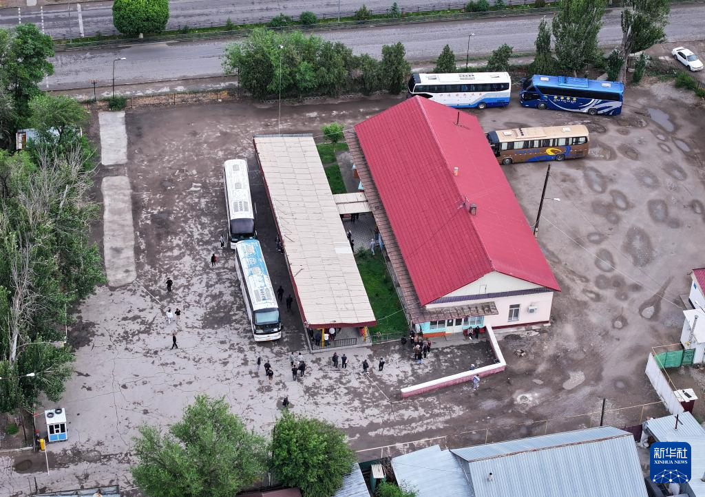5月24日清晨,“摆渡人”在哈萨克斯坦扎尔肯特镇汽车站准备登上返回霍尔果斯的大巴。新华社记者 李任滋 摄