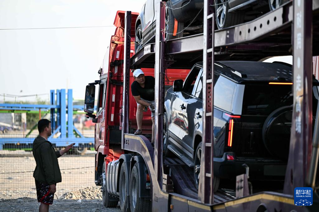 5月22日,运输公司的工作人员驾驶从中国进口的新能源汽车驶向哈萨克斯坦扎尔肯特镇的中转停车场。新华社记者 李任滋 摄