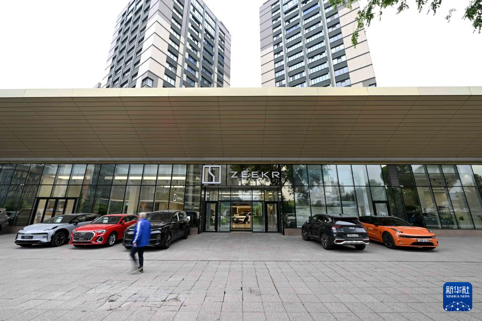 5月26日,在哈萨克斯坦阿拉木图市区,一名男子从一家中国品牌新能源汽车门店前走过。新华社记者 李任滋 摄