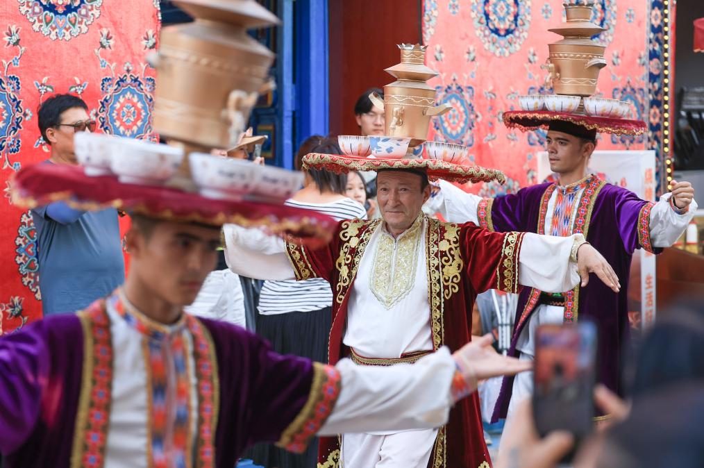 新疆库车市龟兹小巷内,年过六旬的帕尔哈提·伊明头顶铜盘铜壶,脚步轻快,将萨玛瓦尔舞展现在游客面前,来自游客的掌声叫好声不断。