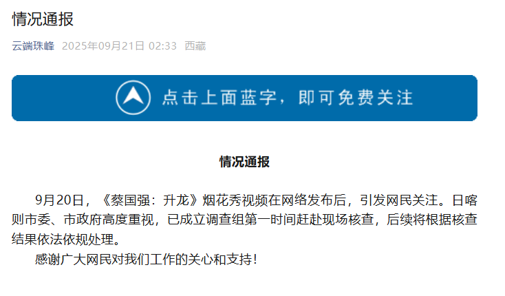 9月20日,《蔡国强:升龙》烟花秀视频在网络发布后,引发网民关注。日喀则市委、市政府高度重视,已成立调查组第一时间赶赴现场核查,后续将根据核查结果依法依规处理。