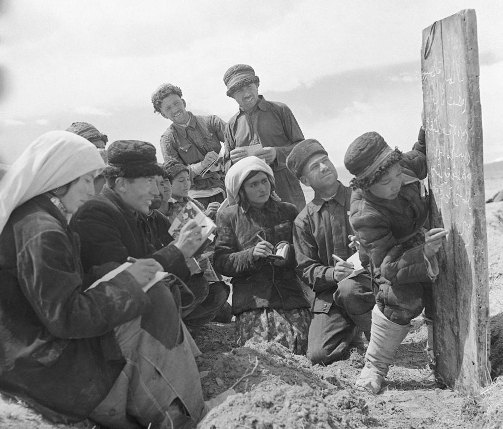 1960年,新疆塔什库尔干塔吉克自治县慕士塔格人民公社二大队的社员在小学生的帮助下在田间学习文化。