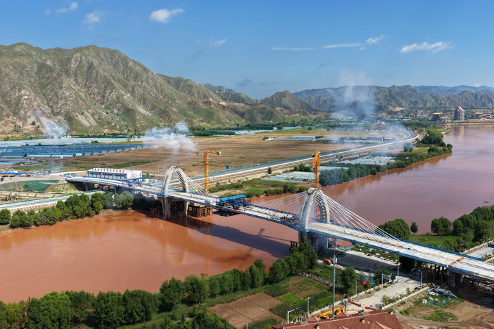 8月29日拍摄的兰州什川黄河大桥顺利完成中跨合龙(无人机照片)。(兰州市委宣传部供图)