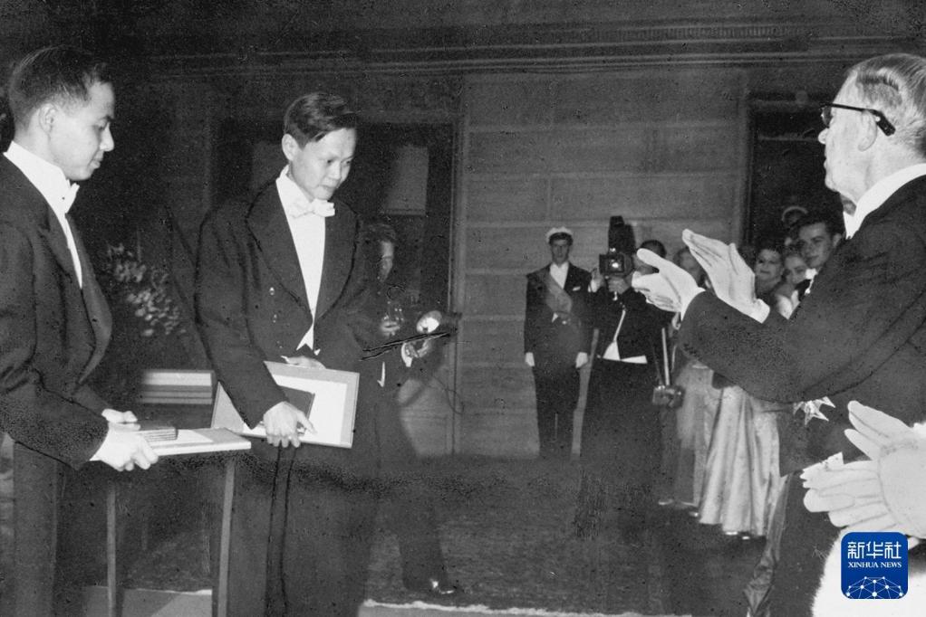 1957年,杨振宁(中)和李政道(左)在瑞典斯德哥尔摩获颁1957年诺贝尔物理学奖。新华社发
