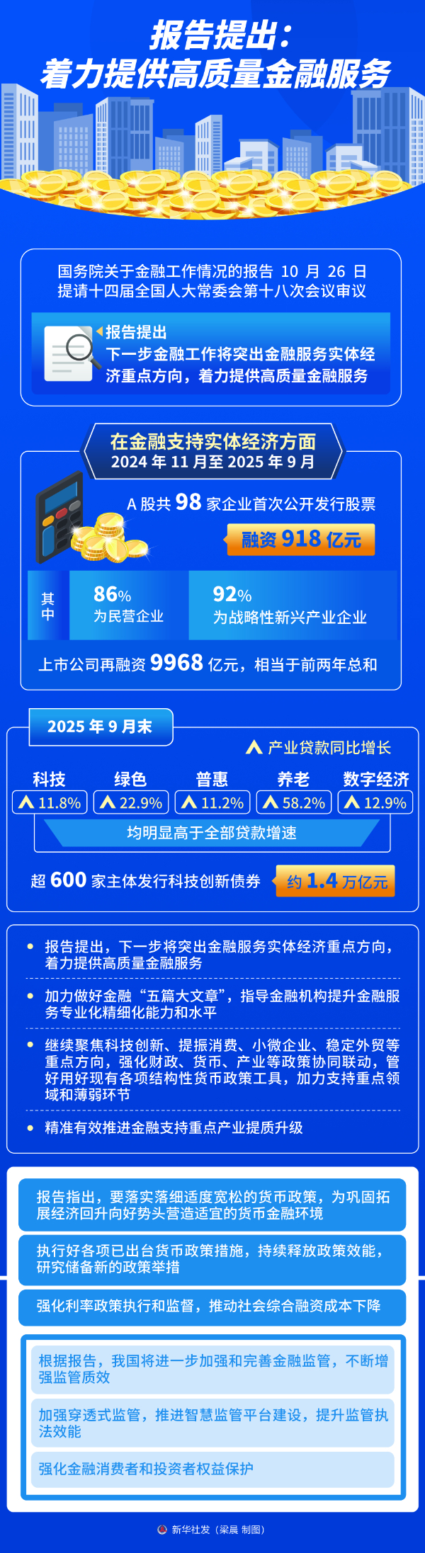 新华社北京10月26日电(记者吴雨)国务院关于金融工作情况的报告26日提请十四届全国人大常委会第十八次会议审议。报告提出,下一步金融工作将突出金融服务实体经济重点方向,着力提供高质量金融服务。