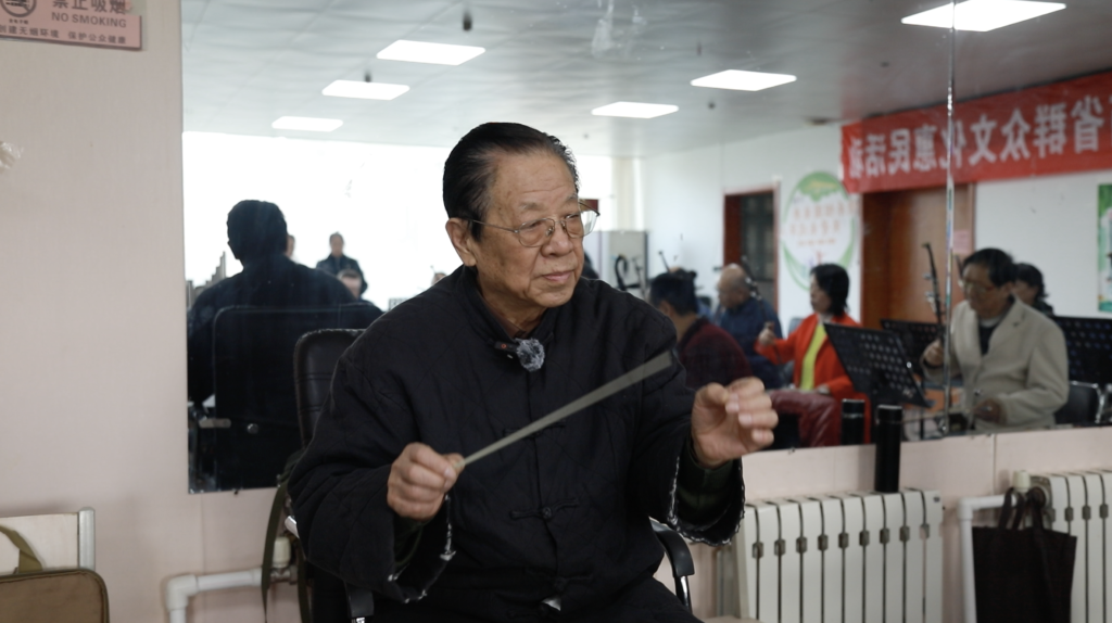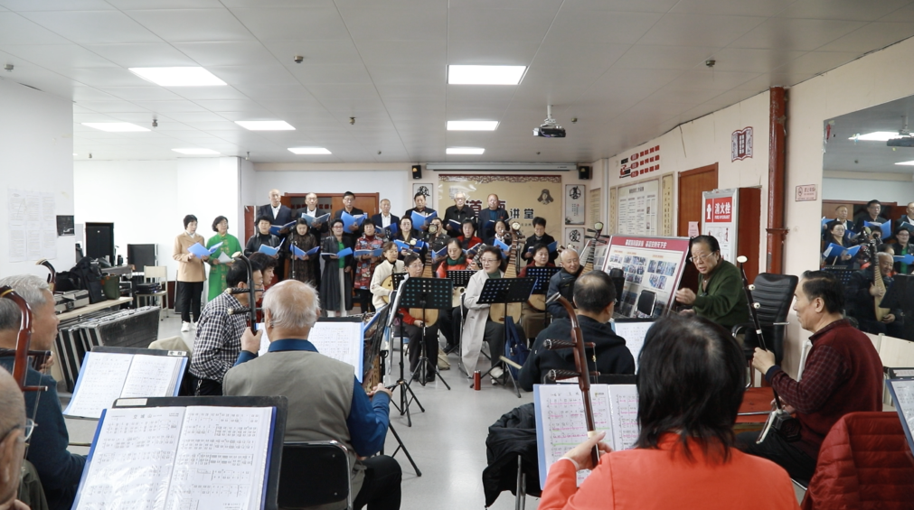 每周日的排练室里,总能看到他挺拔的身影:他站在乐团的中心,手腕轻抬,指挥棒划出弧线,《交城的山》的旋律便淌了出来。若有人音准偏了,他皱下眉,指挥棒轻轻点向对方的谱子,无须多言,乐手便立刻调整,整个排练室满是悠扬的民歌韵味。
