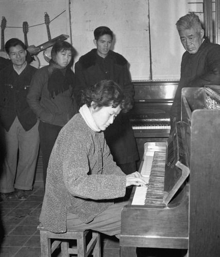 1961年1月21日,北京市乐器厂老工程师王来安(右)在倾听中央乐团钢琴家巫漪丽试弹该厂生产的“星海牌”钢琴,进行鉴定。新华社记者王文西摄