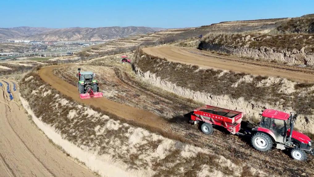 在定西市安定区凤翔镇南廿铺村的梯田上,定西瑞源农产品农民专业合作社组织开展覆膜作业。施肥机、旋耕机、覆膜机协同作业、衔接有序,一垄垄地膜顺着梯田走势铺展,为旱塬披上“冬衣”。