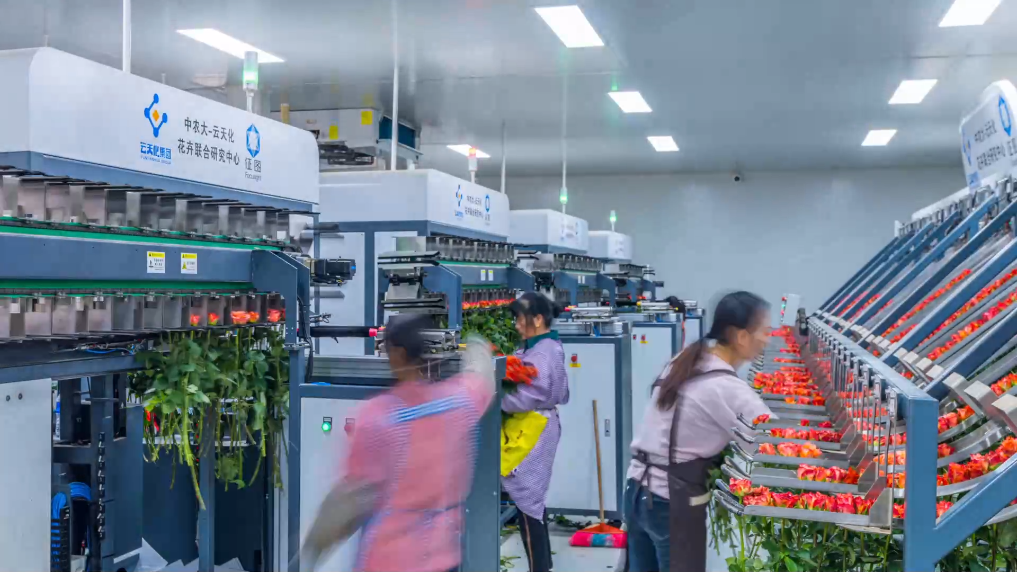 花卉大棚“智慧大脑”中央控制系统实时监测与调控各类环境指标;智慧检测控制水肥一体化循环系统确保植株健康生长;采后处理中心红外成像识别系统实现自动分级分类,自动捆扎与包装。