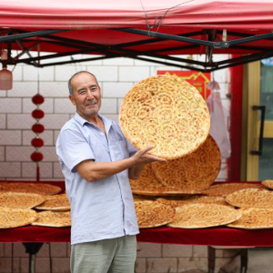 2025年7月21日,在新疆库车市,传统面食制作技艺(馕制作技艺)国家级非遗代表性传承人热西提展示他制作的馕。新华社记者 王婧嫱 摄