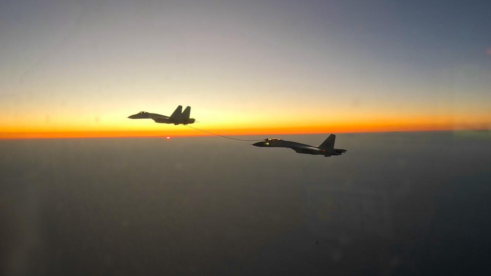 高强度空战对抗训练中,战机油量大幅消耗,编队快速奔赴加油空域,进行空中伙伴加油。