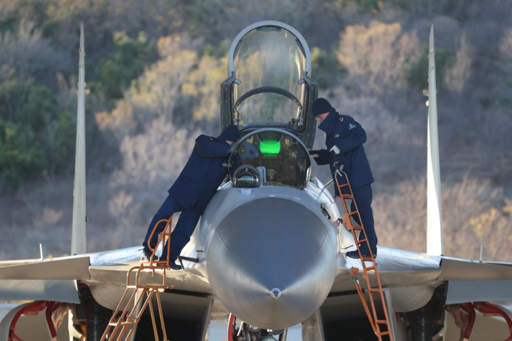夜幕降临,气温骤降,机务保障人员细致做好装备检查维护。数分钟后,参训战机迎着暮色快速升空。