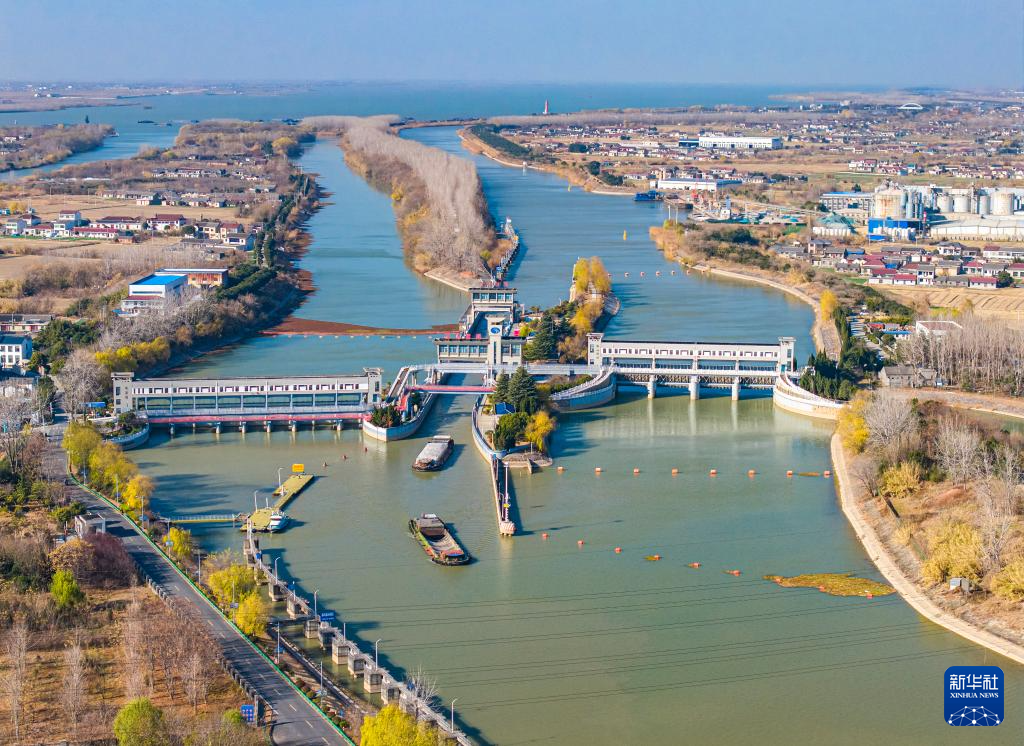12月21日在江苏省扬州市江都区拍摄的南水北调东线一期工程运盐闸、邵仙套闸、邵仙闸洞(无人机照片)。新华社发(任飞摄)