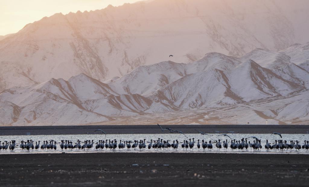 2025年2月20日,在西藏自治区拉萨市林周县越冬的黑颈鹤在虎头山水库边休憩。新华社记者 晋美多吉 摄