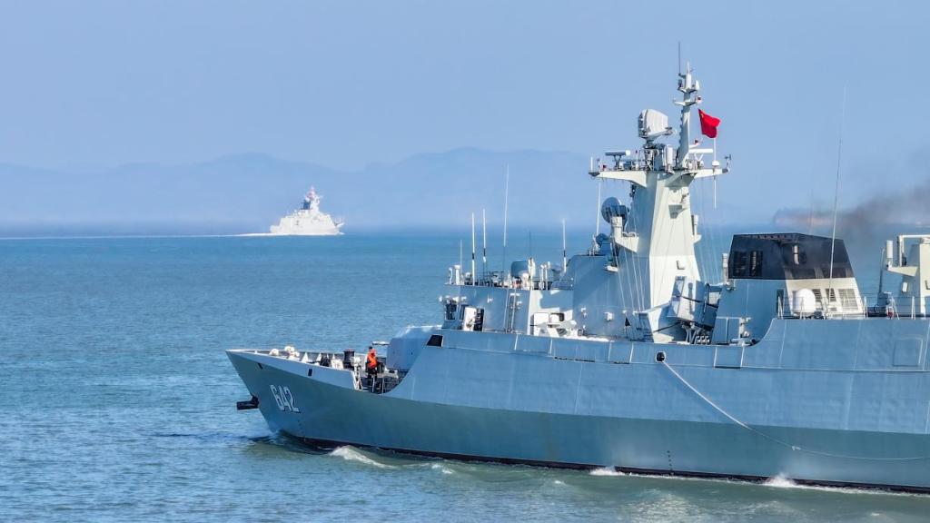 近日,东部战区海军某护卫舰支队衢州舰、温州舰、德阳舰等舰艇组成编队,奔赴某海域开展多科目实战化训练,检验舰艇编队协同作战水平。