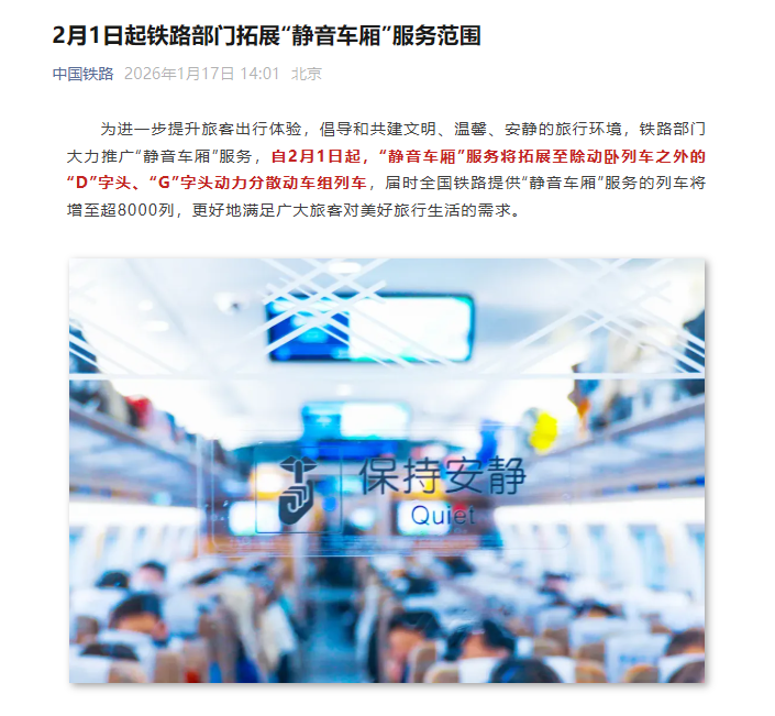 2月1日起铁路部门拓展“静音车厢”服务范围-新华网
