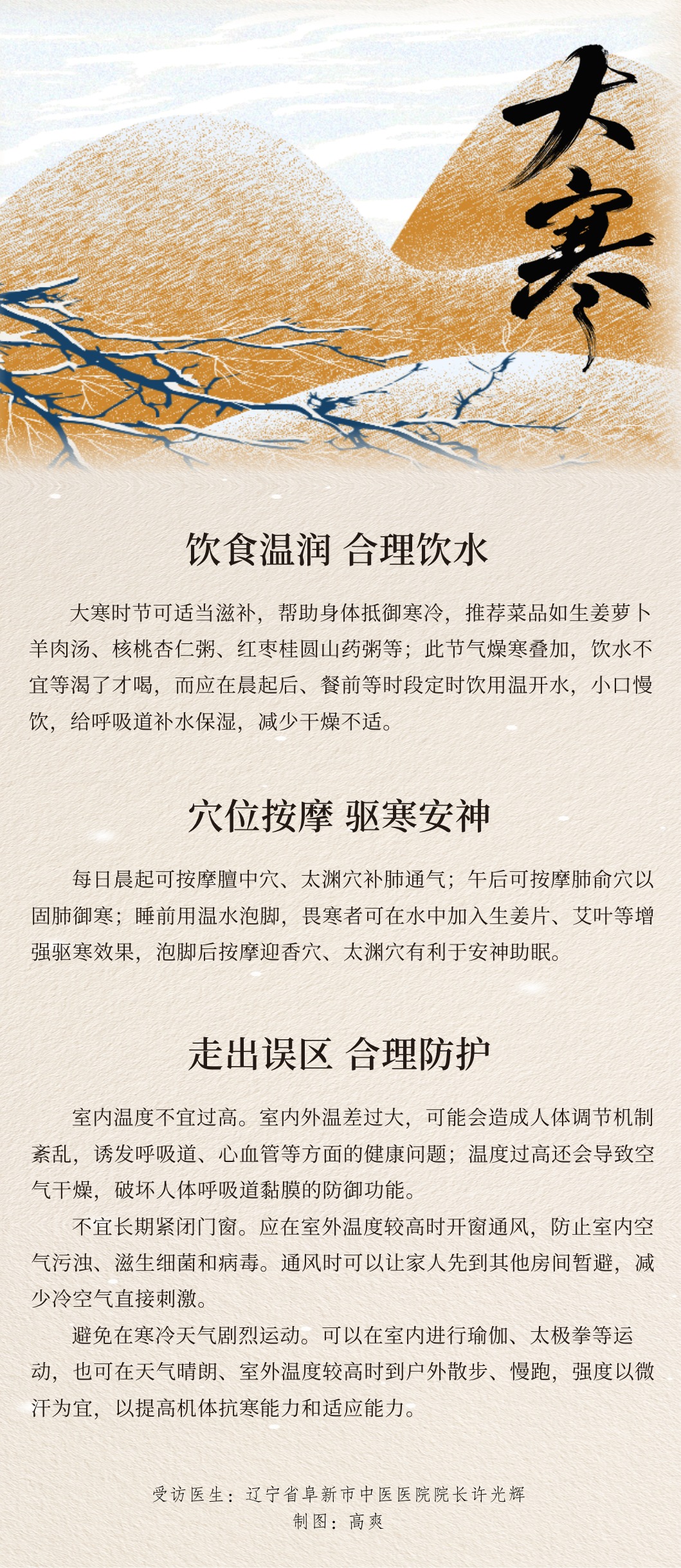 1月20日大寒,二十四节气中最后一个节气。这一时节,我们如何通过合理膳食、穴位保健等达到增强体质的目的?通过海报,了解一下大寒时节的养生知识。