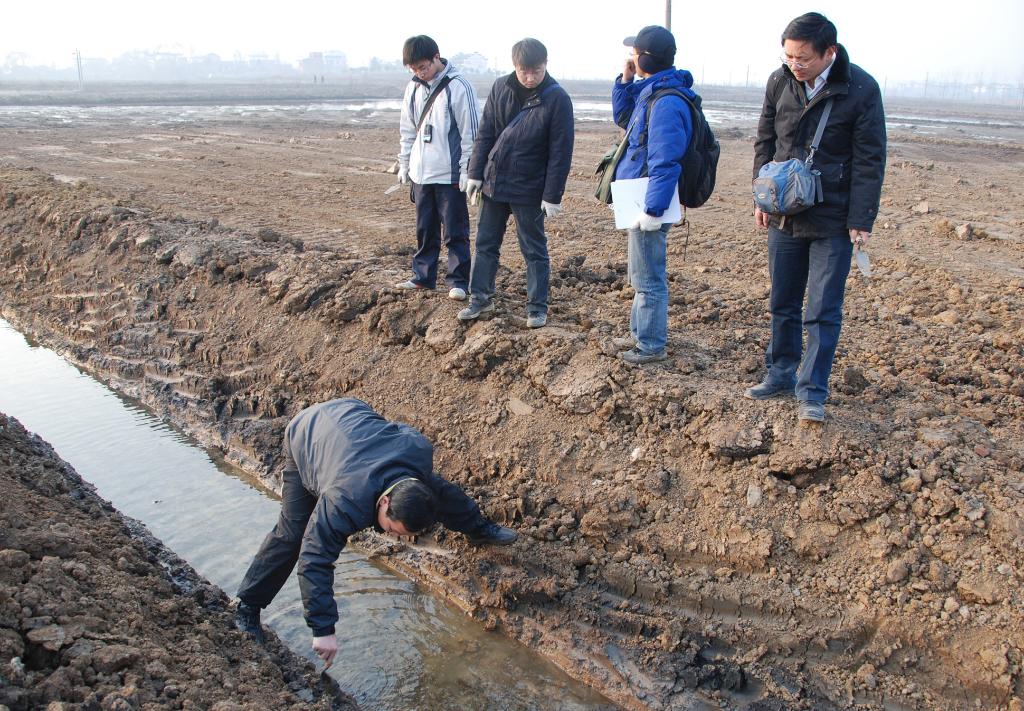 2007年5月17日,考古人员在凌家滩遗址发掘现场用罗盘定位,为2007年5月18日启动的第五次发掘进行前期准备。新华社发