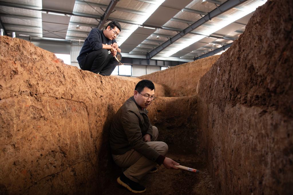 2026年1月13日,张小雷(前)在凌家滩遗址考古发掘现场工作。新华社记者 张端 摄