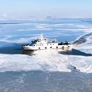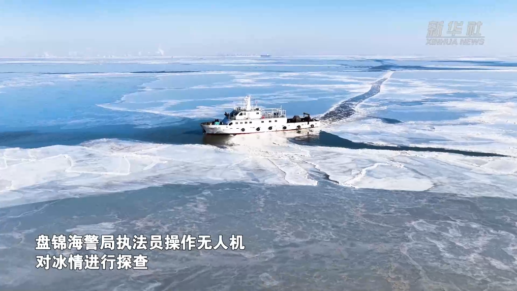 为了实地查看辽东湾结冰的实际情况,记者跟随盘锦海警局工作人员,乘船从盘锦港出发进入辽东湾结冰海域。当船行驶十多海里后,海面上出现大片的浮冰。盘锦海警局执法员操作无人机,对冰情进行探查。