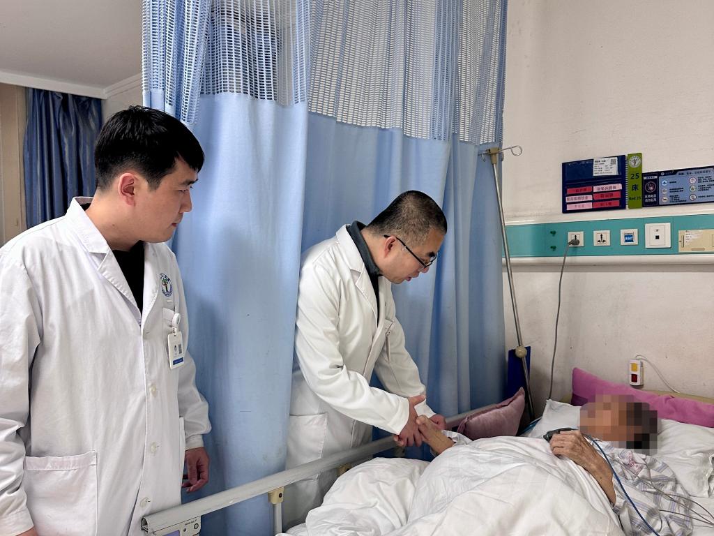 西安市红会医院骨创伤医院综合病区副主任医师王鹏飞(左二)为患者查房。新华社发
