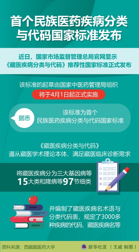 新华社拉萨1月27日电(记者旦增尼玛曲珠)近日,国家市场监督管理总局官网显示《藏医疾病分类与代码》推荐性国家标准正式发布。记者从参与起草的西藏藏医药大学了解到,该标准的起草由国家中医药管理局组织,将于4月1日起正式实施。据悉,该标准为首个民族医药疾病分类与代码国家标准。