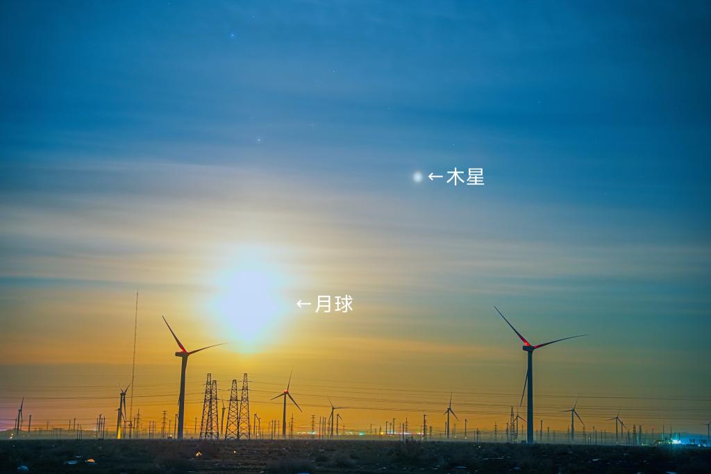 2026年1月4日,在新疆哈密拍摄的木星(右上)伴月。(王俊峰 摄)