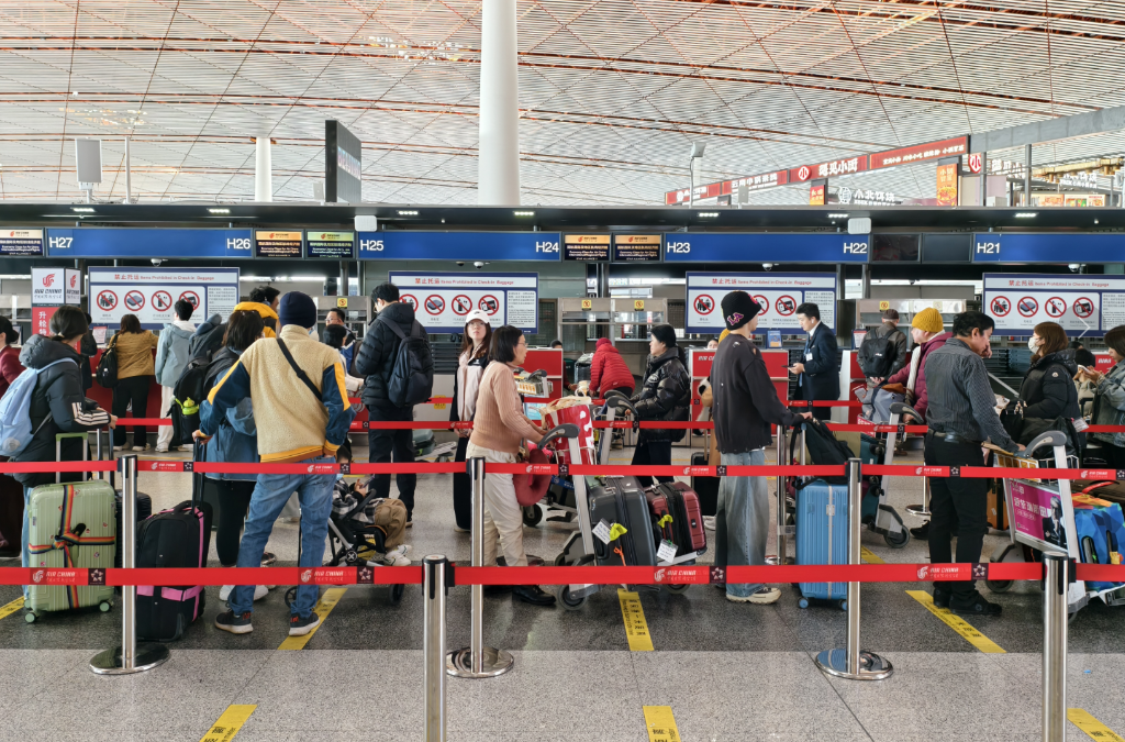2月2日,北京首都机场T3航站楼,旅客排队办理乘机手续。新华社记者王聿昊 摄
