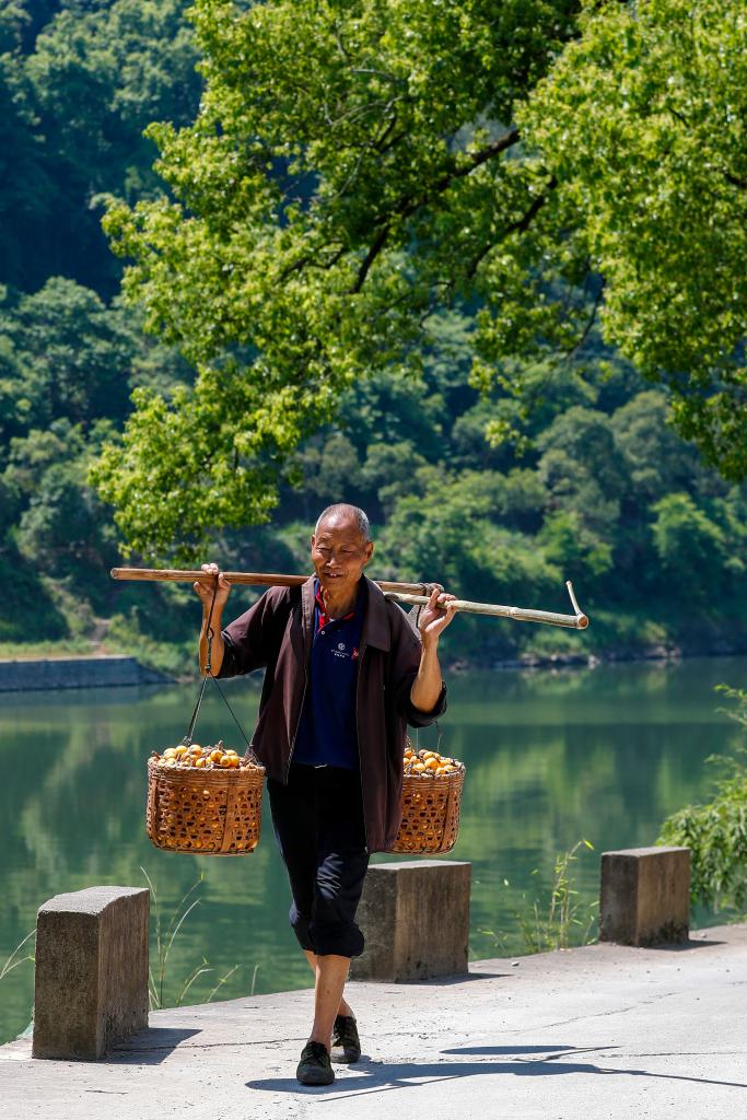 2022年5月6日,安徽省黄山市歙县瀹潭村,果农在挑运“三潭枇杷”。(施亚磊 摄)