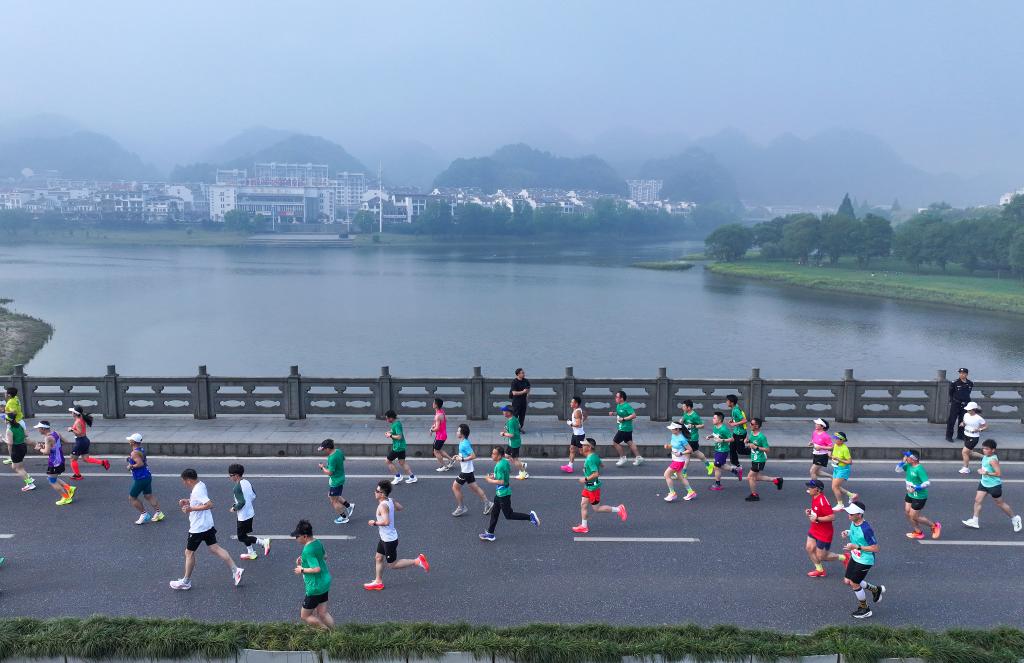 2025年4月20日,参加2025黄山·歙县新安江山水画廊马拉松的选手在比赛中。(施亚磊 摄)
