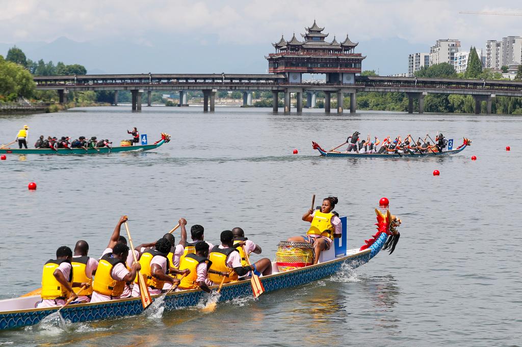 2024年6月8日,在安徽省黄山市屯溪区,参赛龙舟队在龙舟赛中。(施亚磊 摄)