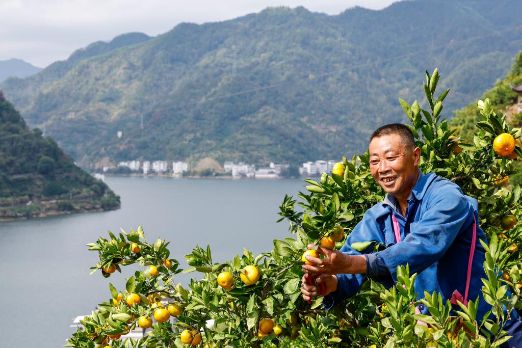 2024年10月17日,果农在黄山市歙县新溪口乡塔坑村新安江畔的果园内采摘“三口柑桔”。 (施亚磊 摄)